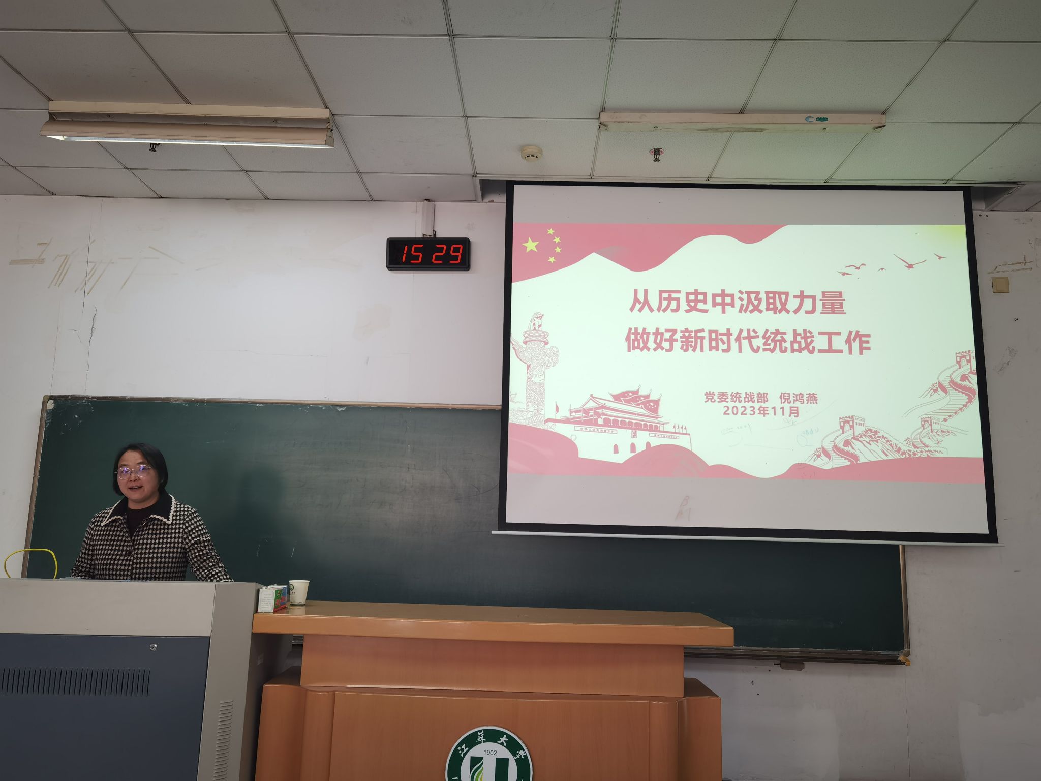 倪鸿燕围绕“从历史中汲取力量,做好新时代统战工作”主题,对高校统战工作作了细致深刻的讲述。她详细论述了党的统一战线所经历的历史发展阶段和如何做好新时代统战工作,并再次明确我们应当坚持党在新时代的统战工作安排,坚持大团结大联合,动员全体中华儿女围绕实现中华民族伟大复兴中国梦一起来想,一起来干。最后,明确教育广大青年在新时代要以习近平新时代中国特色社会主义思想为指导,从政治高度认识统一战线的法宝作用,心怀“国之大者”,发扬斗争精神,树牢底线思维,增强工作本领,团结一切可以团结的力量,调动一切可以调动的积极因素,最大限度凝聚起共同奋斗的力量,努力为全面建设社会主义现代化国家、全面推进中华民族伟大复兴作出更大贡献。