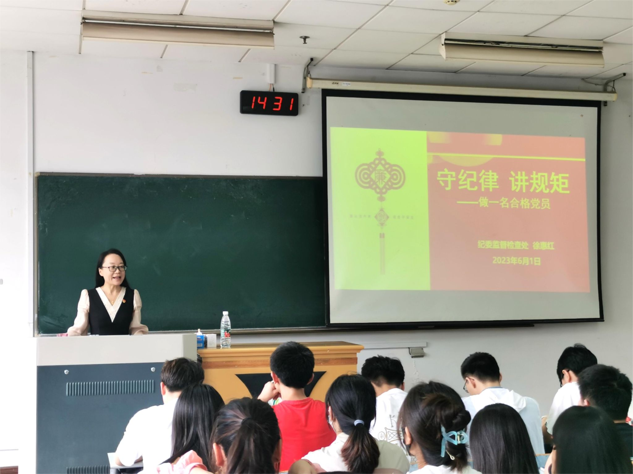 6月1日,91成人 在三江楼206教室举办“守纪律 讲规矩——做一名合格党员”党课。该党课邀请校纪委监督检查处处长徐惠红主讲,91成人 党务办主任贡崇颖主持,91成人 党员、入党积极分子参与。