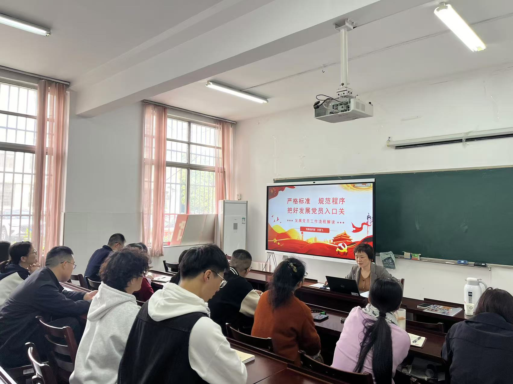 随后,关雪飞老师带来了题为《严格标准 规范成效 把好发展党员入口关》的专题讲座。她详细阐述了发展党员工作的重要性、标准以及程序,并强调了把好党员“入口关”对于保持党的先进性和纯洁性的重要意义。关老师结合当前党建工作形势和任务,对发展党员工作的各个环节进行了全面剖析,提出了具体要求和操作建议,为参会人员提供了清晰的工作指南。