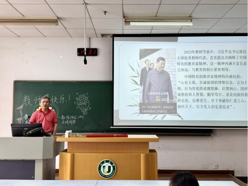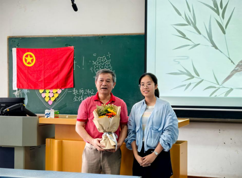 活动正值第41个教师节,现场洋溢着浓浓的尊师之情。团员代表向卢殿臣教授敬献鲜花,表达对老一辈教育工作者的崇高敬意和诚挚祝福。一张张写满感恩话语的“暖心便利贴”拼成爱心图案,传递着师范生对教育事业的深情向往,也深深打动了这位从教四十余年的老教师。