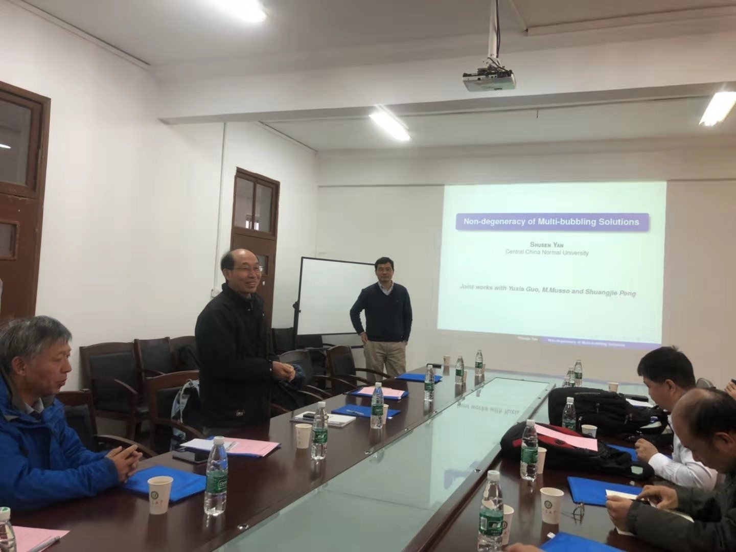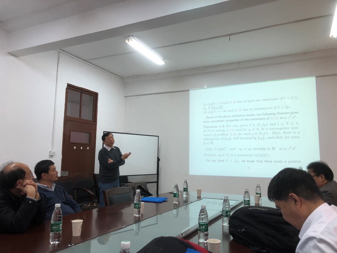 Prof. Peng Shuangjie, a recipient of the National Outstanding Youth Fund and Vice-President of Central China Normal University, gave an academic lecture on “Location and uniqueness of concentration solutions”. He introduced the latest research work on the existence and local concentration uniqueness of semi-classical Schrodinger equation solution.