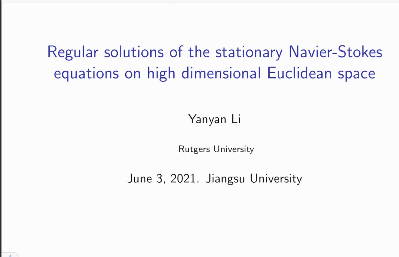 Professor Yanyan Li gave a wonderful academic report on the topic of "Regular solutions of the stationary Navier-Stokes equations on high dimensional Euclidean space", mainly explaining the regularity of weak solutions of static incompressible Navier-stokes equations in high dimensional space. First, he used the Galerkin method to illustrate the existence of weak solutions, and explained the research history of the regularity of weak solutions in low-dimensional spaces. Secondly, he introduced the latest research results on weak solutions of Navier-stokes equations in high-dimensional spaces, and elaborated on the proof idea: By first rewriting the Navier-stokes equation into a certain integral form of equation, then giving the proof of the prior estimation in the regularity theory, and finally using the classic Leray-Schauder degree theory to obtain the existence of smooth weak solutions.