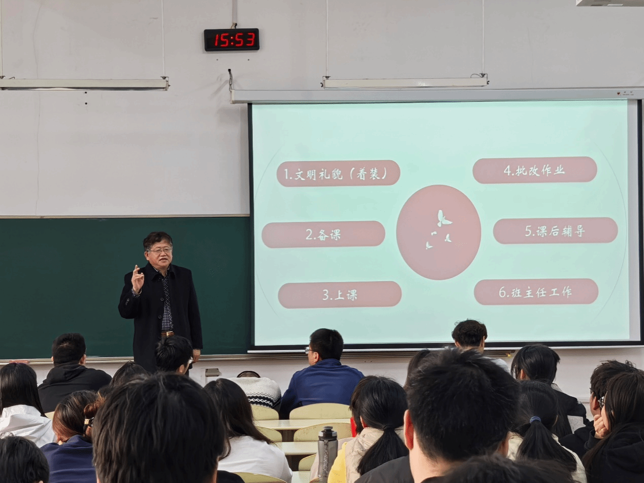 其次,针对实习期间的着装、礼仪等细节,备课、上课、批改作业、课后辅导和班主任工作等问题,宋晓平结合往届案例一一讲解,并作出要求和嘱咐。随后,他就“处理好人际关系”这一话题重点展开,强调实习期间保持好社交距离的重要性并提出要求。宋晓平还分享了几条师范生在实习过程中的困惑并结合案例做出解答,并展示了实习期间的任务,强调了撰写实习日志的重要性。
